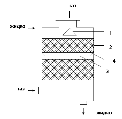 1 – распределитель жидкости; 2 – насадки; 3 – перераспределитель жидкости; 4 – опорные решетки