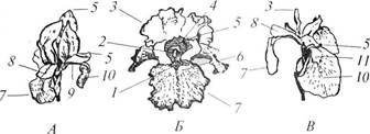 1 — бородка; 2 — тычинка с пыльником; 3 — верхняя доля околоцветника; 4—рыльце пестика; 5 — надрыльцевый гребень; 6 — основание нижней доли околоцветника; 7— нижняя доля околоцветника; 8 — лопасть столбика пестика; 9 - ноготок наружной доли; 10 - отгиб наружной доли; 11 - область сигнала на наружной доле