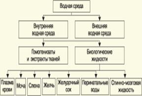 В большинстве случаев термин "водная среда" относят к различным водным объектам, находящимся вне организма человека - к морским и речным водам, иным поверхностным водам суши, подземным водам, промышленным и бытовым стокам, атмосферным осадкам, наконец, к пищевым водам (схема 1). Все эти группы объектов было бы правильнее называть "внешней водной средой".
