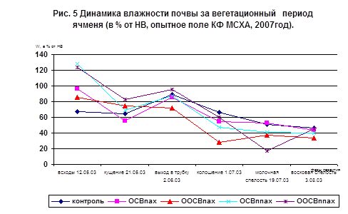 Анализ данных таблицы 8 показывает, что полевая влажность по всем вариантам опыта выше, чем в контроле. Наибольшая влажность почвы наблюдалась в фазу всходов. Установлено, что наименьшая влагоемкость (НВ) почв опытов составляет 13,5 – 14% от АСП. Следовательно, полевая влажность почвы в течение вегетации ячменя находилась в пределах 50 – 98 % от НВ, что является достаточным для формирования как вегетативных, так и генеративных органов растений. В вариантах опыта с внесением ОСВ и ООСВ в подпахотной слой в течение всего периода вегетации ячменя наблюдалась наибольшая влажность почвы, по-видимому, из-за водоупорной функции внесенного под пахотный слой осадков сточных вод.