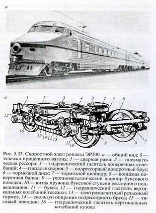 Как известно, в нашей стране в середине 70-х гг. прошлого столетия был создан скоростной поезд ЭР200 (рис. 5.33), развивающий на отдельных участках скорость движения 200 км/ч, который с 1984 г. находится в коммерческой эксплуатации на линии Санкт-Петербург—Москва. Позже был изготовлен еще один состав поезда ЭР200. Для того времени эти поезда вполне отвечали передовым техническим требованиям.
