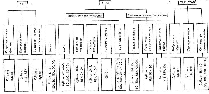 В структуре объектов более 25 типов загрязняющих источников, характеризующихся неодинаковой интенсивностью, температурой, составом, структурой и свойствами веществ-загрязнителей. Более сложные по составу загрязнения поступают в атмосферу от технологических установок по осушке и подготовке газа (УКПГ); при продувке скважин, при выпуске и сжиганий газа на свечах (при ремонтных работах на трубопроводах); из факелов и амбаров. Все опасные загрязнители образуются, в большинстве случаев, при сжигании газа и конденсата. При этом в больших объемах в воздух на КНГКМ (Карачаганакское месторождение) выбрасываются, в основном, токсичные газовые смеси продуктов неполного сгорания, состоящие в основном из девяти компонентов (CnH2n+2, H2S, SO2, SO3, СOx, CO, CO2, RSH, CH3OH). Известно, что разный состав выбросов от источников загрязнений означает их неодинаковое воздействие на основные экологические объекты (воздух, почву и человека), условия труда, работоспособность человека, состояние объемно-производственной среды. При прочих равных условиях смесь токсичных газов опаснее большинства ее отдельных компонентов; чем сложнее состав, тем опаснее загрязнение, его токсикологическое, инженерно-психологическое и другое воздействие на человека, состояние его здоровья, поведение и т.д.